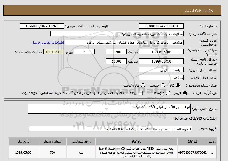 شرح کلی نیاز: لوله سایز 90 پلی اتیلن pe80-فشار6-