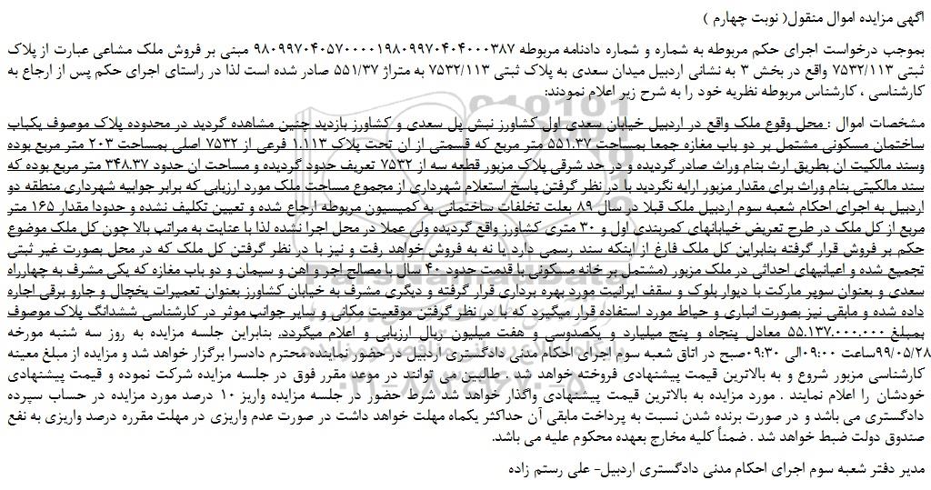 بموجب درخواست اجرای حکم مربوطه به شماره و شماره دادنامه مربوطه 98099704057000019809970404000387 مبنی بر فروش ملک مشاعی عبارت از پلاک ثبتی 7532/113 واقع در بخش 3 به نشانی اردبیل میدان سعدی به پلاک ثبتی 7532/113 به متراژ 551/37 صادر شده است لذا در راستای اجرای حکم پس از ارجاع به کارشناسی ، کارشناس مربوطه نظریه خود را به شرح زیر اعلام نمودند: