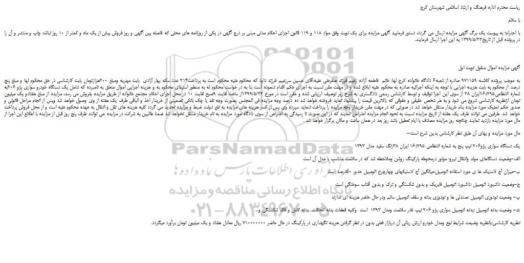 به موجب پرونده کلاسه 971159 صادره از شعبه6 دادگاه خانواده کرج لها: خانم  فاطمه آزاده زعیم فرزند صفرعلی علیه:آقای حسین سرزعیم فرزند داود که محکوم علیه محکوم است به پرداخت214 عدد سکه بهار آزادی  بابت مهریه ومبلغ 200هزارتومان بابت کارشناسی در حق محکوم لها و مبلغ پنج درصد از محکوم به بابت هزینه اجرایی با توجه به اینکه اجرائیه صادره به محکوم علیه ابلاغ شده و در مهلت مقرر نسبت به اجرای حکم اقدام ننموده است بنا به در خواست محکوم له به منظور استیفای محکوم به و هزینه اجرایی اموال متعلق به نامبرده که شامل یک دستگاه خودرو سواری پژو 206به شماره انتظامی295د16ایران 38 از سوی این اجرا توقیف و توسط کارشناس رسمی دادگستری به شرح زیر توصیف ارزیابی شده و مقرر است در مورخ 1399/5/23از ساعت لغایت 9صبح لغایت 10 در محل اجرای احکام مجتمع خانواده از طریق مزایده بفروش می رسد، مزایده از مبلغ هفتادو یک میلیون تومان ازنظریه کارشناسی شروع می شود و به هر شخص حقیقی و حقوقی که بالاترین قیمت را پیشنهاد نماید فروخته خواهد شد ده درصد وجه مزایده فی المجلس بصورت وجه نقد یا چک بانکی تضمینی از خریدار اخذ و الباقی ظرف یک هفته از وی وصول خواهد شد وپس از انجام مراحل قانونی و صدور حکم تملیک مورد مزایده بنام خریدار منتقل خواهد شد در صورتی که در مهلت مقرر خریدار وجه مزایده را پرداخت ننماید سپرده وی پس از کسر هزینه های مزایده به نفع دولت ضبط و مزایده تجدید می گردد کلیه هزینه های نقل و انتقال به عهده محکوم علیه است و از محل فروش پرداخت خواهد شد. طرفین می توانند ظرف یک هفته از تاریخ مزایده نسبت به نحوه انجام مزایده اعتراض نمایند که در این صورت تا رسیدگی به اعتراض از سوی دادگاه مورد مزایده به نام خریدار منتقل نخواهد شد ضمنا طالبین به شرکت در مزایده می توانند ظرف پنج روز قبل از مزایده با اطلاع این اجرا از مال مورد مزایده بازدید نمایند چنانچه روز مزایده مصادف با ایام تعطیل باشد روز بعد در همان ساعت و مکان برگزار خواهد شد .