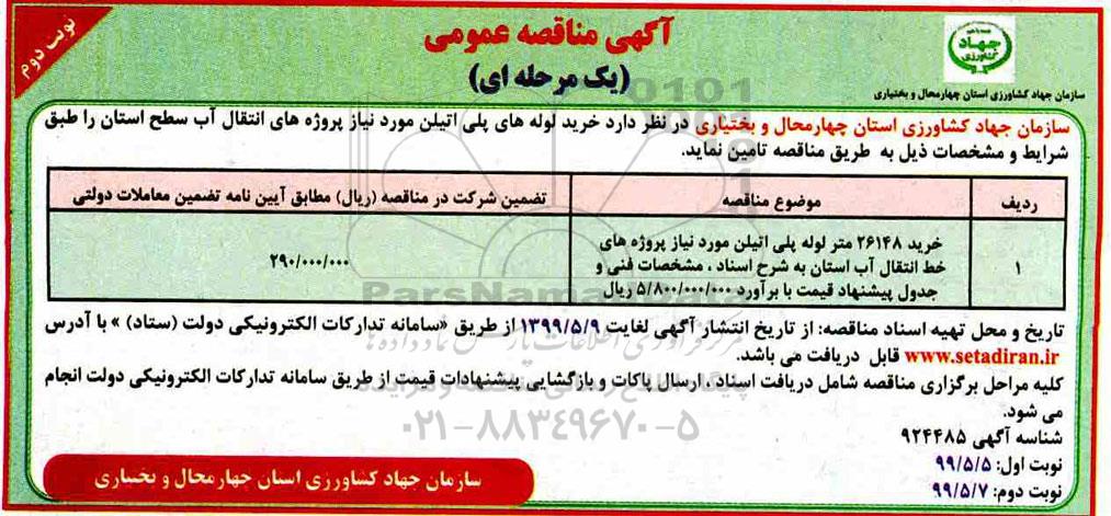 سازمان جهاد کشاورزی استان چهارمحال و بختیاری در نظر دارد خرید لوله های پلی اتیلن مورد نیاز پروژه های انتقال آب سطح استان را طبق شرایط و مشخصات ذیل به طریق مناقصه تامین نماید.