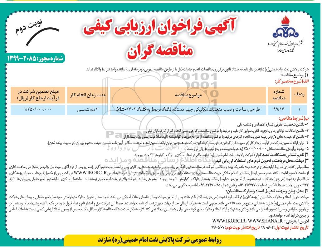 فراخوان مناقصه طراحی، ساخت و نصب متعلقات مکانیکی چهار دستگاه API مربوط به ME-2603 A/B - نوبت دوم , فراخوان مناقصه طراحی، ساخت و نصب متعلقات مکانیکی چهار دستگاه API مربوط به ME-2603 A/B - نوبت دوم