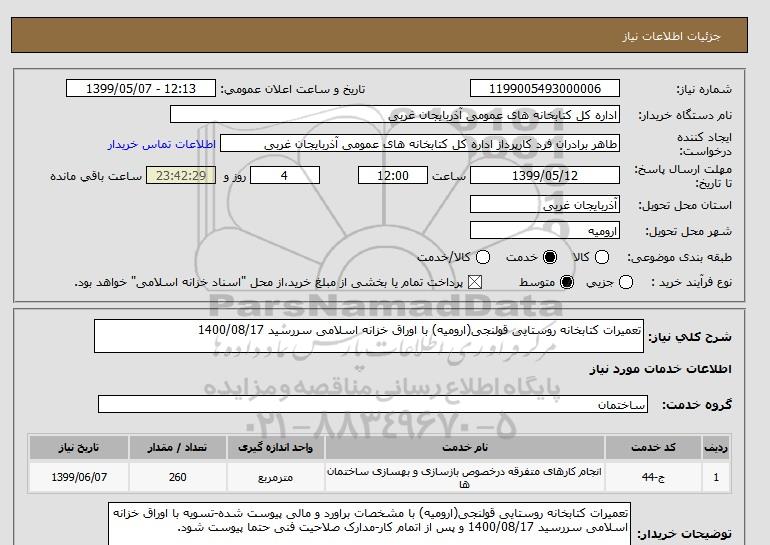 شرح کلی نیاز: تعمیرات کتابخانه روستایی قولنجی(ارومیه) با اوراق خزانه اسلامی سررسید 1400/08/17
