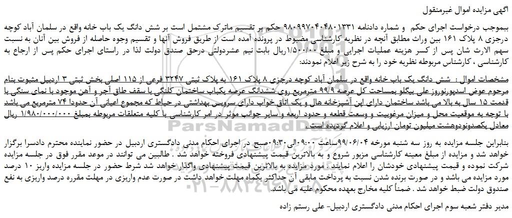 مشخصات اموال :  شش دانگ یک باب خانه واقع در سلمان آباد کوچه درجزی 8 پلاک 161 به پلاک ثبتی 3247 فرعی از 115 اصلی بخش ثبتی 3 اردبیل مثبوت بنام مرحوم عوض اسدپورنوروز علی بیگلو بمساحت کل عرصه 99/9 مترمربع روی ششدانگ عرصه یکباب ساختمان کلنگی با سقف طاق آجر و آهن موجود با نمای سنگی با قدمت 15 سال به بالا می باشد ساختمان دارای اپن آشپزخانه هال و یک اتاق خواب دارای سرویس بهداشتی در حیاط که مجموع اعیانی آن حدودا 74 مترمربع می باشد با توجه به موقعیت محل و میزان مرغوبیت و وسعت قطعه و حدود اربعه و سایر جوانب موثر در امر کارشناسی با کلیه متعلقات مربوطه بمبلغ 1/980/000/000 ریال معادل یکصدونودوهشت میلیون تومان ارزیابی و اعلام گردیده است .