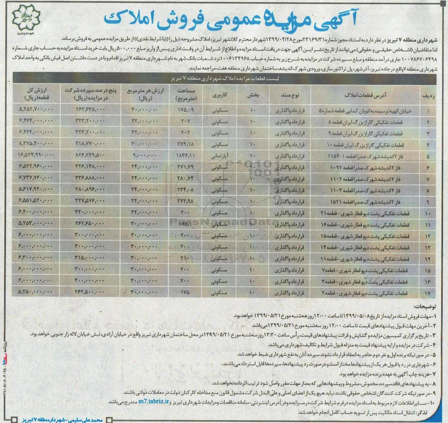 مزایده عمومی مزایده فروش املاک کاربری مسکونی برگزار میگردد. از کلیه افراد متخصص و شرکتهای واجد شرایط دعوت به عمل میآید تا در این مزایده با کد خبرگزاری پارس نماد : 2583498 شرکت نمایند تاریخ شروع مزایده : 1399/05/08 مهلت شرکت در مزایده: تا پایان روز 1399/05/21 مکان برگزاری اموال واگذاری استانهای آذربایجان شرقی و دستهبندیهای مربوط به این حراجی املاک و زمین میباشد.