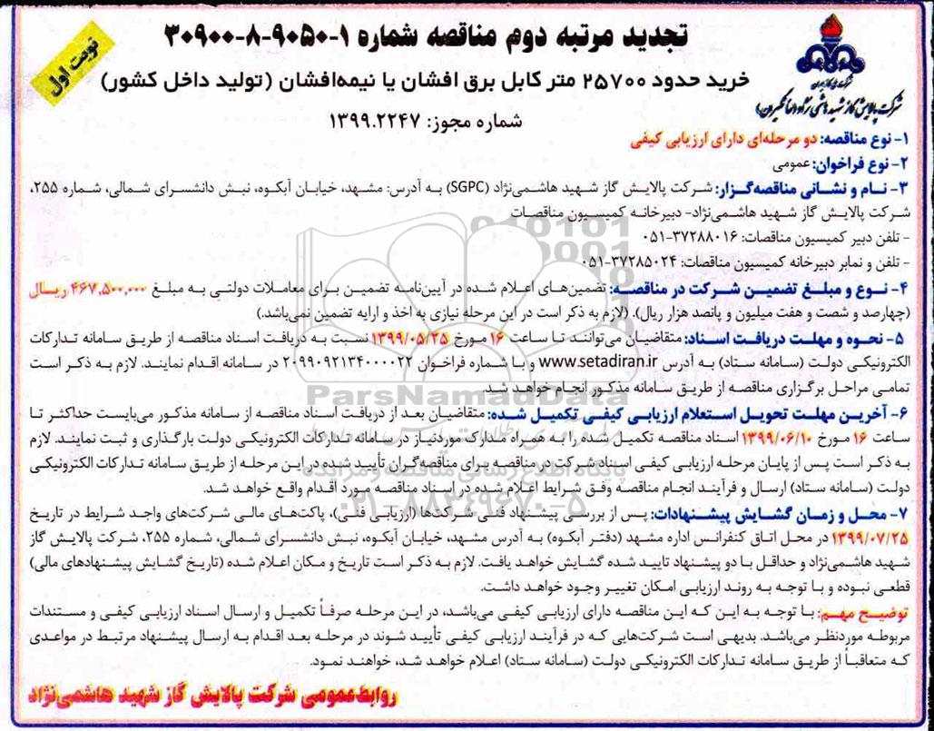 تجدید مناقصه خرید حدود 25700 متر کابل برق افشان یا نیمه افشان تولید داخل کشور, تجدید مناقصه خرید حدود 25700 متر کابل برق افشان یا نیمه افشان تولید داخل کشور