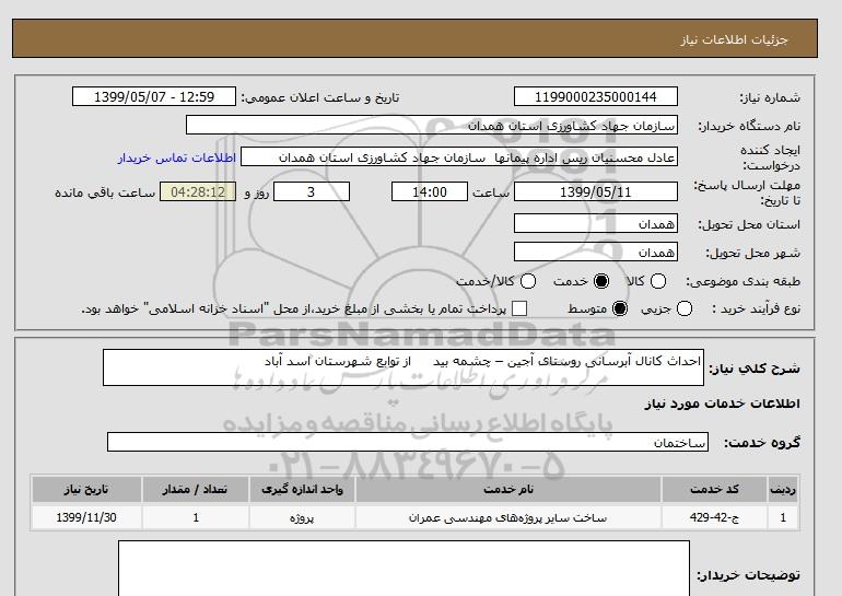 شرح کلی نیاز: احداث کانال آبرسانی روستای آجین – چشمه بید از توابع شهرستان اسد آباد