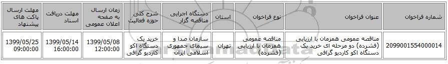 | 2099001554000014 | مناقصه عمومی همزمان با ارزیابی (فشرده) دو مرحله ای خرید یک دستگاه اکو کاردیو گرافی | مناقصه عمومی همزمان با ارزیابی (فشرده) | تهران | سازمان صدا و سیمای جمهوری اسلامی ایران | خرید یک دستگاه اکو کاردیو گرافی | 1399/05/08 12:00:00 | 1399/05/14 16:00:00 | 1399/05/25 09:00:00 |