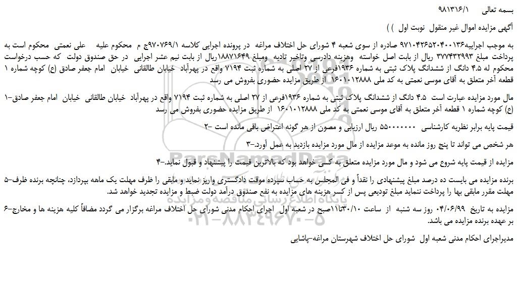 به موجب اجراییه9710426520400136 صادره از سوی شعبه 4 شورای حل اختلاف مراغه  در پرونده اجرایی کلاسه 970769/1ج م  محکوم علیه    علی نعمتی  محکوم است به پرداخت مبلغ 377432993 ریال از بابت اصل خواسته  وهزینه دادرسی وتاخیر تادیه  ومبلغ 18871649ریال از بابت نیم عشر اجرایی  در حق صندوق دولت  که حسب درخواست محکوم له 4.5 دانگ از ششدانگ پلاک ثبتی به شماره 1936فرعی از 27 اصلی به شماره ثبت 7194 واقع در پهرآباد  خیابان طالقانی  خیابان  امام جعفر صادق (ع) کوچه شماره 1 قطعه آخر متعلق به آقای موسی نعمتی به کد ملی 1601012888  از طریق مزایده حضوری بفروش می رسد