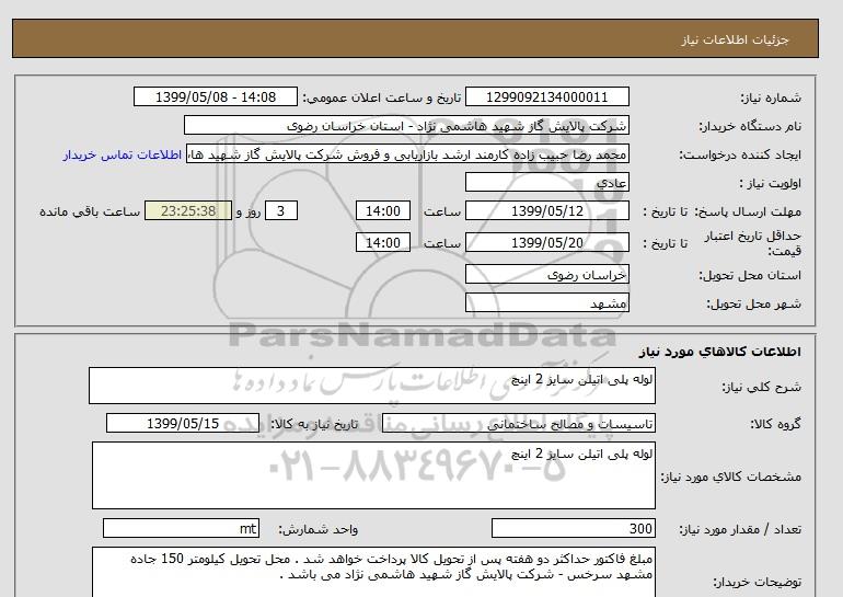 نام دستگاه خریدار:شرکت پالایش گاز شهید هاشمی نژاد - استان خراسان رضوی