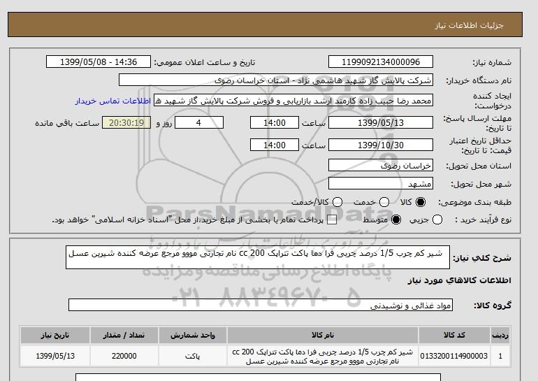 نام دستگاه خریدار:شرکت پالایش گاز شهید هاشمی نژاد - استان خراسان رضوی