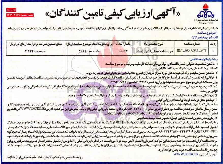 شرکت پالایش نفت امام خمینی (ره) شازند در نظر دارد کالاهای موضوع بند یک اگهی حاضر را  طریق برگزاری مناقصه عمومی دو مرحله ای از تامین کننده کالا واجد شرایط خریداری و تامین نماید.