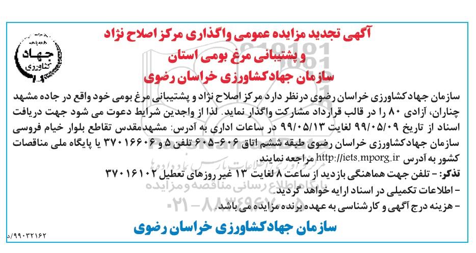 مزایده عمومی تجدید مزایده واگذاری مرکز اصلاح نژاد وپشتیبانی مرغ بومی برگزار میگردد. از کلیه افراد متخصص و شرکتهای واجد شرایط دعوت به عمل میآید تا در این مزایده با کد خبرگزاری پارس نماد : 2586924 شرکت نمایند تاریخ شروع مزایده : 1399/05/09 مهلت شرکت در مزایده: تا پایان روز 1399/05/13 مکان برگزاری اموال واگذاری استانهای مزایدات استان خراسان رضوی و دستهبندیهای مربوط به این حراجی ماشین آلات و تجهیزات کشاورزی و دام پروری, واگذاری ورزشگاه، پارکینگ، غرفه و بوفه میباشد.