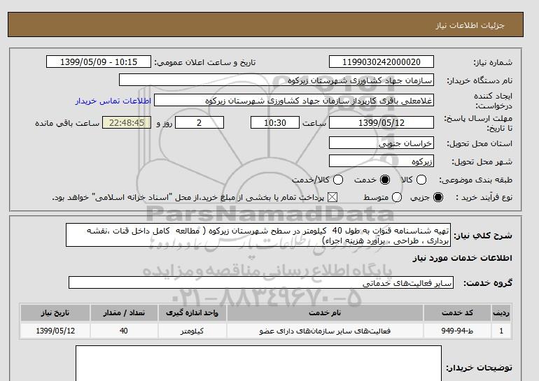 شرح کلی نیاز: تهیه شناسنامه قنوات به طول 40 کیلومتر در سطح شهرستان زیرکوه ( مطالعه کامل داخل قنات ،نقشه برداری ، طراحی ، برآورد هزینه اجراء)