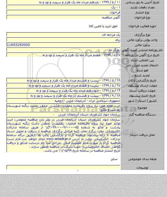 سازمان جهاد کشاورزی استان آذربایجان غربی در نظر دارد مناقصه عمومی: خرید لوازم مورد نیاز پروژه باقیمانده عملیات زهکشی عمقی دشت زنگنه شهرستان پلدشت و ماکو به شماره (۲۰۹۹۰۰۰۰۹۶۰۰۰۰۰۵)را از طریق سامانه تدارکات الکترونیکی دولت برگزار نماید.کلیه مراحل برگزاری مناقصه از دریافت و تحویل اسناد مناقصه تا ارائه پیشنهاد مناقصه گران و بازگشایی پاکت ها ،ازطریق درگاه سامانه تدارکات الکترونیکی دولت به آدرس www.setadiran.ir انجام خواهد شد.لازم است مناقصه گران در صورت عدم عضویت قبلی ،مراحل ثبت نام درسایت مذکور و دریافت گواهی امضای الکترونیکی را جهت شرکت در مناقصه محقق سازند .