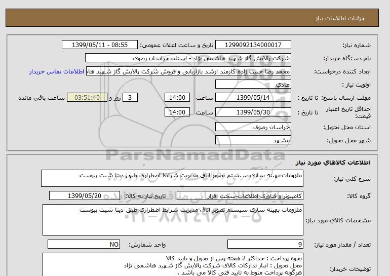 نام دستگاه خریدار:شرکت پالایش گاز شهید هاشمی نژاد - استان خراسان رضوی