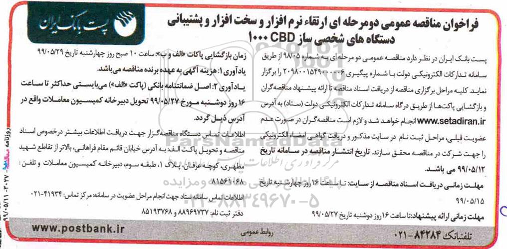 پست بانک ایران در نظر دارد مناقصه عمومی دو مرحله ای به شماره 98/05 از طریق سازمانه تدارکات الکترونیکی دولت با شماره پیگیری 2098001549000006 برگزار نماید کلیه مراحل برگزاری مناقصه از دریافت اسناد مناقصه تا ارائه پیشنهاد مناقصه گران و بازگشایی پاکتها از طریق درگاه سامانه تدارکات الکترونیکی دولت ستاد به آدرس ستاد ایران انجام خواهد شد و لازم است مناقصه گران در صورت عدم عضویت قبلی مراحل ثبت نام در سایت مذکور و دریافت گواهی امضا الکترونیکی را جهت شرکت در مناقصه محقق سازند