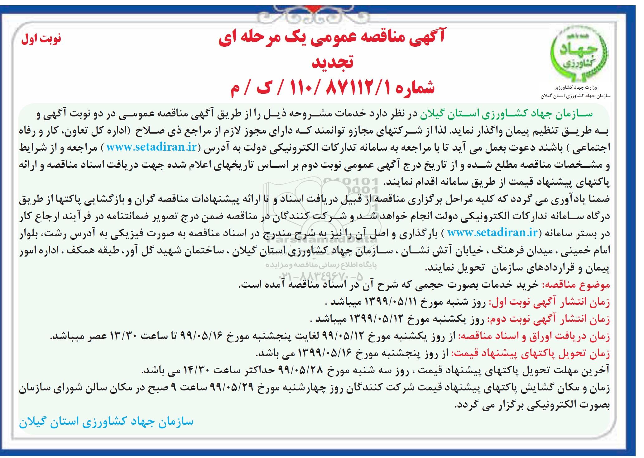 سازمان جهاد کشاورزی استان گیلان در نظر دارد خدمات مشروحه ذیل را از طریق آگهی عمومی دو دو نوبت اگهی و به طریق تنظیم پیمان واگذار نماید. لذا از کلیه شرکت های مجاز و توانمند که دارای مجوز لازم از مراجع ذی صلاح اداره کل تعاون کار و رفاه اجتماعی باشند دعوت به عمل می آید تا با مراجعه به سامانه تدارکات لکترونیکی دولت سایت ستاد مراجعه و از شرایط و مشخصات مناقصه مطلع شده و براساس تاریخ درج آگهی عمومی نوبت دوم براساس تاریخ های اعلام شده جهت دریافت اسناد مناقصه و ارائه پاکت های پیشنهاد قیمت از طریق سامانه ستاد اقدام نماید.