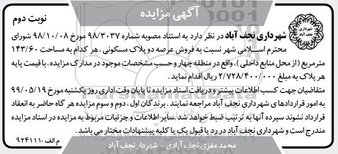 مزایده فروش عرصه دو پلاک مسکونی 143.60 مترمربع نوبت دوم