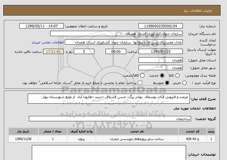 شرح کلی نیاز: مرمت و لایروبی قنات روستای بهادر بیگ- حسن قشلاق –دربند –هارون آباد از توابع شهرستان بهار