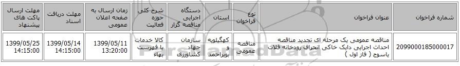 | 2099000185000017 | مناقصه عمومی یک مرحله ای تجدید مناقصه احداث اجرایی دایک خاکی انحراف رودخانه قلات یاسوج ( فاز اول ) | مناقصه عمومی | کهگیلویه و بویراحمد | سازمان جهاد کشاورزی | کالا خدمات با فهرست بهاء | 1399/05/11 13:20:00 | 1399/05/14 14:15:00 | 1399/05/25 14:15:00 |
