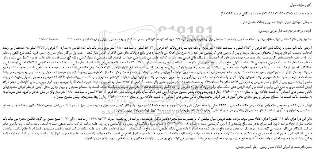 دستورفروش ماترک شامل دوباب مغازه ویک باب خانه مسکونی ودرخواست خواهان مبنی برتوقیف وفروش آن،املاک مورد نظرتوسط کارشناس رسمی دادگستری به شرح ذیل ارزیابی و قیمت گذاری شده است./. مشخصات ملک: