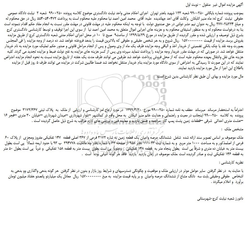 بموجب پرونده شماره بایگانی 9900250 شعبه 123 شهید باهنر تهران  اجرای احکام مدنی واحد نیابت دادگستری موضوع کلاسه پرونده 9900250  شعبه 2  نیابت دادگاه عمومی حقوقی  نیابت  کرج له: ماه منیر اتابکان  وکالت آقای احد جهاندیده  علیه: آقای  محمد امین احمد نیا محکوم علیه محکوم است به پرداخت 5540540472 ریال در حق محکوم له  و مبلغ 277025224 ریال به عنوان نیم عشر دولتی در حق صندوق دولت  با توجه به اینکه محکوم علیه در مهلت قانونی در مهلت مقرر نسبت به انجام مفاد حکم اقدام ننموده است بنا به درخواست محکوم له و به منظور استیفای محکوم به و هزینه های اجرایی اموال متعلق به محمد امین احمد نیا  از سوی این اجرا توقیف و توسط کارشناسی دادگستری کرج بشرح ذیل توصیف و ارزیابی شده و مقرر گردیده از طریق مزایده در مورخ 1399/5/29 از ساعت9  صبح تا  10 در محل اجرای احکام مدنی شعبه دادگستری کرج از طریق مزایده بفروش برسد. مزایده از قیمت 15700000000  ریال شروع و به هر شخص حقیقی و حقوقی که بالاترین قیمت را بدهد فروخته خواهد شد. ده درصد از وجه مزایده را فی المجلس بصورت وجه نقد یا چک بانکی تضمینی از خریدار اخذ و الباقی وجه مزایده ظرف یک ماه از وی وصول و پس از انجام مراحل قانونی و صدور حکم تملیک مورد مزایده به نام خریدار منتقل خواهد شد. در صورتی که در مهلت مقرر خریدار وجه مزایده را پرداخت ننماید سپرده وی پس از کسر هزینه های مزایده به نفع دولت ضبط و مزایده تجدید می گردد. کلیه هزینه های نقل وانتقال بعهده محکوم علیه است که از محل فروش پرداخت خواهد شد طرفین می توانند ظرف مدت یک هفته از تاریخ مزایده نسبت به نحوه انجام مزایده اعتراض نمایند که در این صورت تا رسیدگی به اعتراض از سوی دادگاه مورد مزایده بنام خریدار منتقل نخواهد شد ضمنا طالبین شرکت در مزایده می توانند ظرف 5 روز قبل از مزایده بااطلاع این اجرا از مال مورد مزایده بازدید نمایند.
