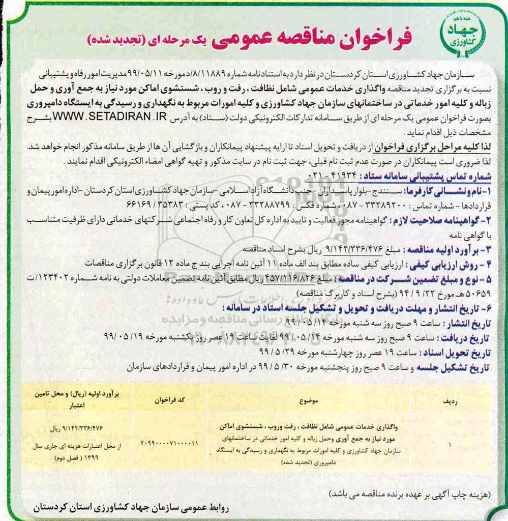 سازمان جهاد کشاورزی استان کردستان در نظر دارد نسبت به برگزاری تجدید مناقصه اجرای واگذاری خدمات عمومی