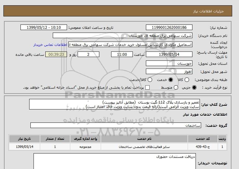 استعلام تعمیر و بازسازی پلاک 112 گیت بوستان (مطابق آنالیز پیوست) سایت ویزیت الزامی است(ارائه قیمت بدون سایت ویزیت فاقد اعتبار است), استعلام تعمیر و بازسازی پلاک 112 گیت بوستان (مطابق آنالیز پیوست) سایت ویزیت الزامی است(ارائه قیمت بدون سایت ویزیت فاقد اعتبار است)