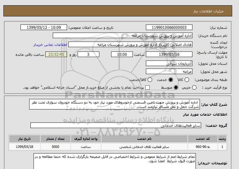 شرح کلی نیاز: اداره آموزش و پرورش جهت تامین قسمتی ازخودروهای مورد نیاز خود به دو دستگاه خودروی سواری تحت نظر شرکت حمل و نقل مسافر نیازمند است.