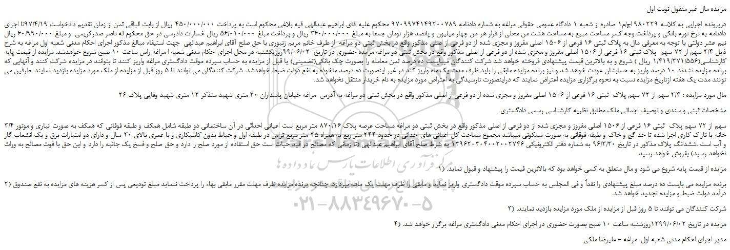 درپرونده اجرایی به کلاسه 980229 اج/م1 صادره از شعبه 1 دادگاه عمومی حقوقی مراغه به شماره دادنامه 9709974149200789 محکوم علیه اقای ابراهیم عبدالهی قیه بلاغی محکوم است به پرداخت 450/000/000 ریال از بابت الباقی ثمن از زمان تقدیم دادخواست 97/4/19تا اجرای دادنامه به نرخ تورم بانکی و پرداخت وجه کسر مساحت مبیع به مساحت هشت من محلی از قرار هر من چهار میلیون و پانصد هزار تومان جمعا به مبلغ 360/000/000 ریال و پرداخت مبلغ 56/010/000 ریال خسارات دادرسی در حق محکوم له ناصر صدرکریمی و مبلغ 60/990/000 ریال نیم عشر دولتی با توجه به معرفی مال به پلاک ثبتی 16 فرعی از 1506 اصلی مفروز و مجزی شده از دو فرعی از اصلی مذکور واقع در بخش ثبتی دو مراغه از طرف خانم مریم زنبوری با حق صلح آقای ابراهیم عبدالهی جهت استیفاء مبالغ مذکور اجرای احکام مدنی شعبه اول مراغه به شرح ذیل 3/4 سهم از 72 سهم پلاک ثبتی 16 فرعی از 1506 اصلی مفروز و مجزی شده از دو فرعی از اصلی مذکور واقع در بخش ثبتی دو مراغه مزایده حضوری در تاریخ 99/06/02روزیکشنبه در محل اجرای احکام مدنی شعبه ا مراغه راس ساعت 10 صبح شروع خواهدشد. مزایده از قیمت پایه کارشناسی(1/419/371/556 ریال ) شروع و به بالاترین قیمت پیشنهادی فروخته خواهد شد شرکت کنندگان میبایست ده درصد ثمن معامله را بصورت چک بانکی(تضمینی) یا قبل از مزایده به حساب سپرده موقت دادگستری مراغه واریز کنند تا بتوانند در مزایده شرکت کنند و آنهایی که برنده مزایده نشدند 10 درصد واریز به حسابشان عودت خواهد شد و نیز برنده مزایده مابقی را باید ظرف مدت یک ماه واریز کند در غیر اینصورت ده درصد ماخوذه به نفع دولت ضبط خواهدشد. شرکت کنندگان می توانند تا 5 روز قبل از مزایده از ملک مورد مزایده بازدید نمایند .طرفین می توانند مدت یک هفته ازتاریخ مزایده نسبت به نحوه برگزاری مزایده اعتراض نمایند که دراینصورت تارسیدگی به اعتراض مورد مزایده به نام خریدار منتقل نخواهد شد.