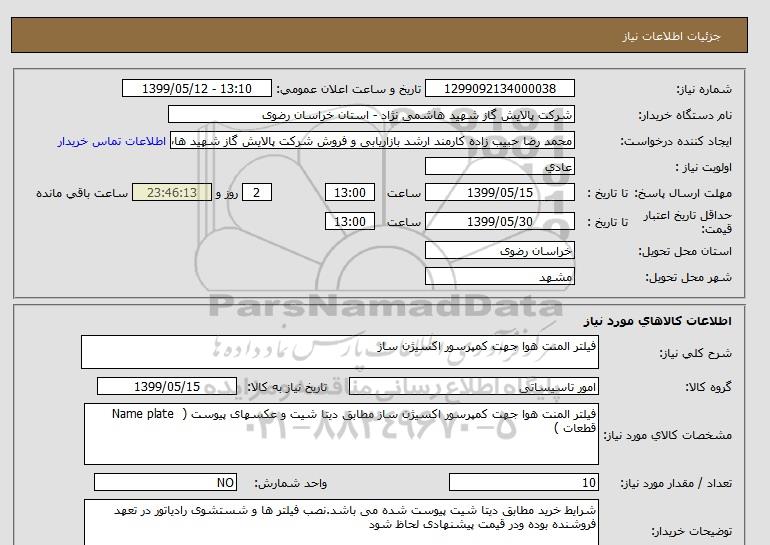 نام دستگاه خریدار:شرکت پالایش گاز شهید هاشمی نژاد - استان خراسان رضوی
