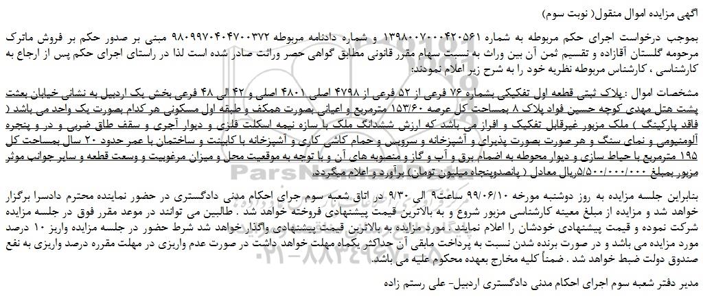 شعبه صادر کننده:شعبه سوم اجرای احکام مدنی دادگستری شهرستان اردبیل