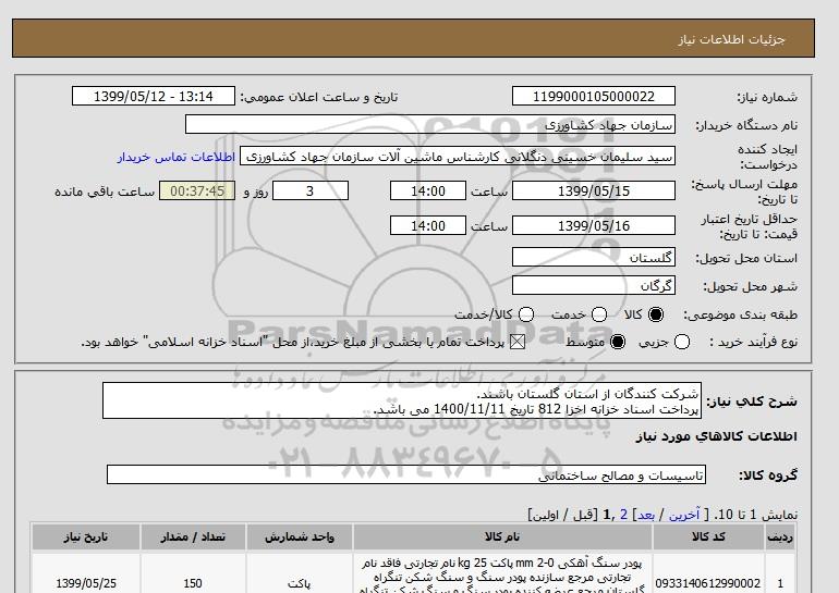 شرح کلی نیاز: شرکت کنندگان از استان گلستان باشند. پرداخت اسناد خزانه اخزا 812 تاریخ 1400/11/11 می باشد.