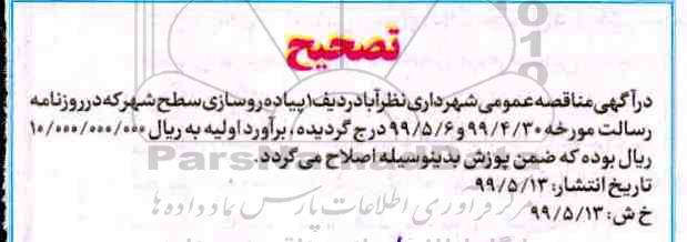 در اگهی مناقصه عمومی شهرداری نظرآباد ردیف 1 پیاده روسازی سطح شهر که در روزنامه رسالت مورخ 99.4.30 و 99.5.6 درج گردیده براورد اولیه به ریال 10.000.000.000 ریال بوده که ضمن پوزش بدینوسیله اصلاح میگردد