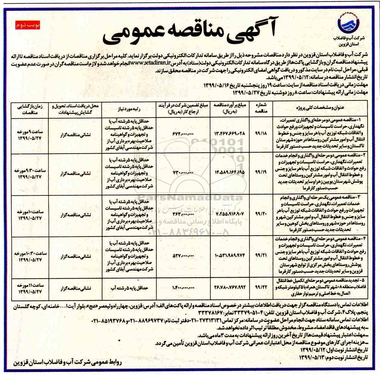 | 1- مناقصه عمومی دو مرحله ای واگذاری تعمیرات، نگهداری، حراست تاسیسات و تجهیزات و رفع حوادث و اتفاقات شبکه توزیع آب هر سایز و جنس و خطوط انتقال آب و امور مشترکین روستاها در حوزه شهرستان تاکستان و سایر تحدیثات جدید حسب دستور کارفرما |