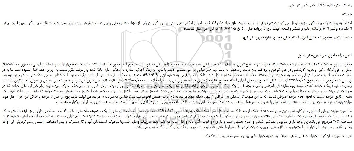 به موجب پرونده کلاسه 9900302 صادره از شعبه 258 دادگاه خانواده شهید مفتح تهران لها: خانم آمنه عبدالمالکی علیه آقای محمد محمود زاده ملکی محکوم علیه محکوم است به پرداخت تعداد 114 عدد سکه تمام بهار آزادی و خسارات دادرسی به میزان 16/558/000 تومان و حق الوکاله وکیل و هزینه کارشناسی در حق خواهان و پرداخت پنج درصد از محکوم به بابت نیم عشر دولتی در حق صندوق دولت با توجه به اینکه اجرائیه صادره به محکوم علیه ابلاغ شده ودر مهلت مقرر نسبت به اجرای حکم اقدام ننموده است بنا به در خواست محکوم له به منظور استیفای محکوم به و هزینه اجرایی، 0/75 دانگ از سه دانگ مشاع از کل شش دانگ ملک توقیفی به شماره ثبتی 146/11629 متعلق به محکوم علیه از سوی این اجرا توقیف و توسط کارشناس رسمی دادگستری به شرح زیر توصیف وارزیابی شده و مقرر است در مورخ 1399/06/05 ازساعت 8 الی 9 صبح در محل اجرای احکام مجتمع خانواده از طریق مزایده بفروش می رسد، مزایده از قیمت 562/500/000 ریال نظریه کارشناسی شروع می شود و به هر شخص حقیقی و حقوقی که بالاترین قیمت را پیشنهاد نماید فروخته خواهد شد ده درصد وجه مزایده فی المجلس بصورت وجه نقد یا چک بانکی تضمینی از خریدار اخذ والباقی ظرف یک ماه از وی وصول خواهد شد و پس از انجام مراحل قانونی و صدور حکم تملیک مورد مزایده بنام خریدار منتقل خواهد شد در صورتیکه در مهلت مقرر خریدار وجه مزایده را پرداخت ننماید سپرده وی پس از کسر هزینه های مزایده به نفع دولت ضبط ومزایده تجدید می گردد کلیه هزینه های نقل وانتقال به عهده محکوم علیه است واز محل فروش پرداخت خواهد شد.طرفین می توانند ظرف یک هفته از تاریخ مزایده نسبت به نحوه انجام مزایده اعتراض نمایند که در این صورت تا رسیدگی به اعتراض از سوی دادگاه مورد مزایده به نام خریدار منتقل نخواهد شد ضمنا طالبین به شرکت در مزایده می توانند ظرف پنج روز قبل از مزایده با اطلاع این اجرا از مال مورد مزایده بازدید نمایند چنانچه روز مزایده مصادف با ایام تعطیل باشد روز بعد در همان ساعت ومکان و درصورت تعطیلی اداره صرفا در ساعت تعیینی مندرج در آگهی مراسم مزایده در اولین ساعت کاری بعد از آن برگزار خواهد شد .