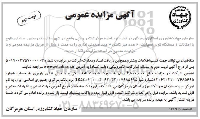 سازمان جهاد کشاورزی استان هرمزگان در نظر دارد اجاره مرکز تکثیر و کپی واقع در شهرستان بندرعباس، خیابان طلوع با امکانات 1 دستگاه کولر اسپلیت، 2 عدد میز کانتر، 4 عدد صندلی اداری را به مدت 1 سال از طریق مزایده عمومی و با جزئیات مندرجات در اسناد مزایده واگذار نماید .