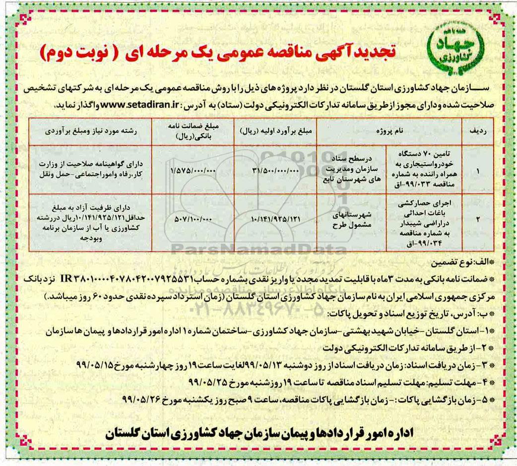سازمان جهاد کشاورزی استان گلستان در نظر دارد پروژه های ذیل را با روش مناقصه عمومی یک مرحله ای به شرکت های تشخیص صلاحیت شده ودارای مجوز از طریق سامانه تدارکات دولت ستاد به ادرس سایت ستاد واگذار نماید.