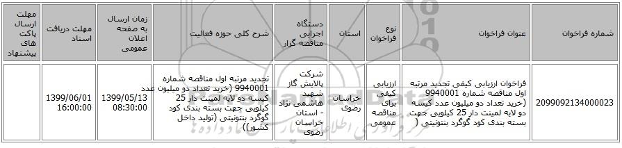 | 2099092134000023 | فراخوان ارزیابی کیفی تجدید مرتبه اول مناقصه شماره 9940001 (خرید تعداد دو میلیون عدد کیسه دو لایه لمینت دار 25 کیلویی جهت بسته بندی کود گوگرد بنتونیتی ( | ارزیابی کیفی برای مناقصه عمومی | خراسان رضوی | شرکت پالایش گاز شهید هاشمی نژاد - استان خراسان رضوی | تجدید مرتبه اول مناقصه شماره 9940001 (خرید تعداد دو میلیون عدد کیسه دو لایه لمینت دار 25 کیلویی جهت بسته بندی کود گوگرد بنتونیتی (تولید داخل کشور)) | 1399/05/13 08:30:00 | 1399/06/01 16:00:00 |