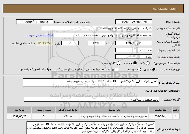 توضیحات خریدارتعمیر 2 دستگاه باتری شارژر 125 ولت و یک دستگاه باتری شارژر 48 ولت DC مدل RITAL مستقر در پست های برق سادلمی هندیجان با احتساب هزینه بیمه -کلیه هزینه های رفت وآمد برعهده پیمانکار می باشد -پرداخت پس از انجام کار وتایید کارفرما صورت می گیرد