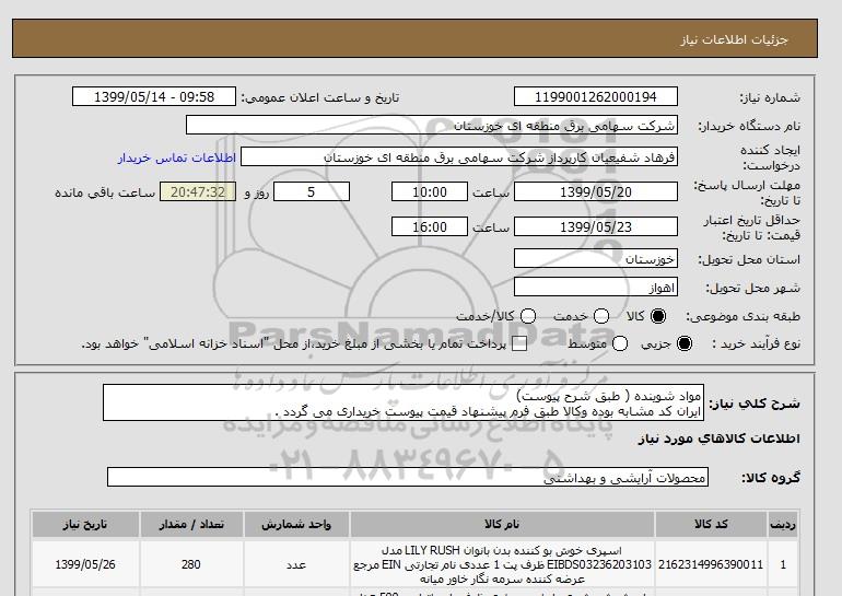 استعلام مواد شوینده ( طبق شرح پیوست) ایران کد مشابه بوده وکالا طبق فرم پیشنهاد قیمت پیوست خریداری می گردد ., استعلام مواد شوینده ( طبق شرح پیوست) ایران کد مشابه بوده وکالا طبق فرم پیشنهاد قیمت پیوست خریداری می گردد .
