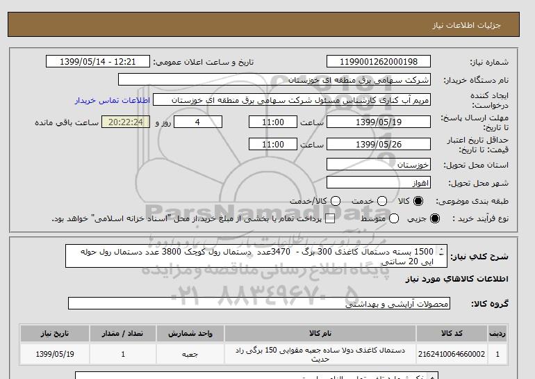 شرح کلی نیاز: 1500 بسته دستمال کاغذی 300 برگ - 3470عدد دستمال رول کوچک 3800 عدد دستمال رول حوله ایی 20 سانتی