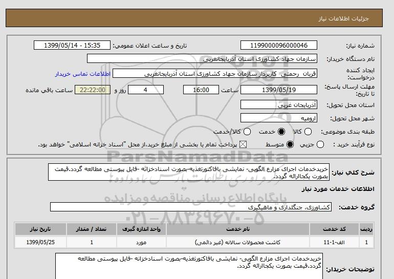 شرح کلی نیاز: خریدخدمات اجرای مزارع الگویی- نمایشی بافاکتورتغذیه-بصورت اسنادخزانه -فایل پیوستی مطالعه گردد.قیمت بصورت یکجاارائه گردد.