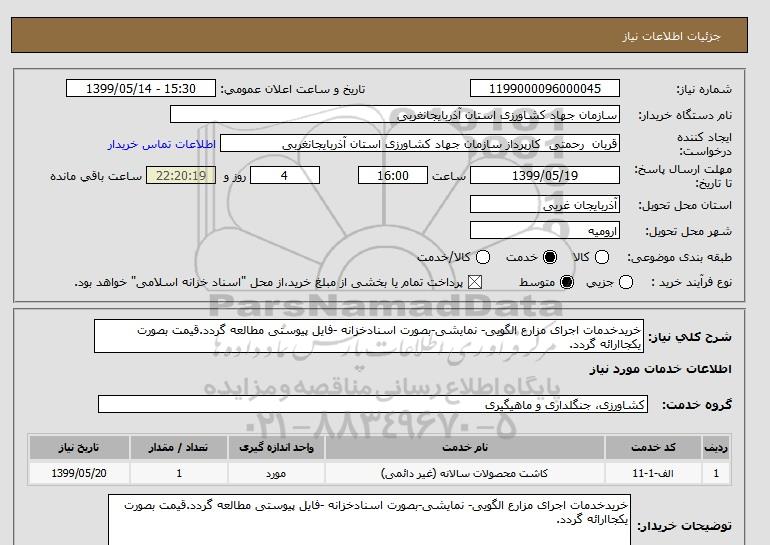 توضیحات خریدارخریدخدمات اجرای مزارع الگویی- نمایشی-بصورت اسنادخزانه -فایل پیوستی مطالعه گردد.قیمت بصورت یکجاارائه گردد.