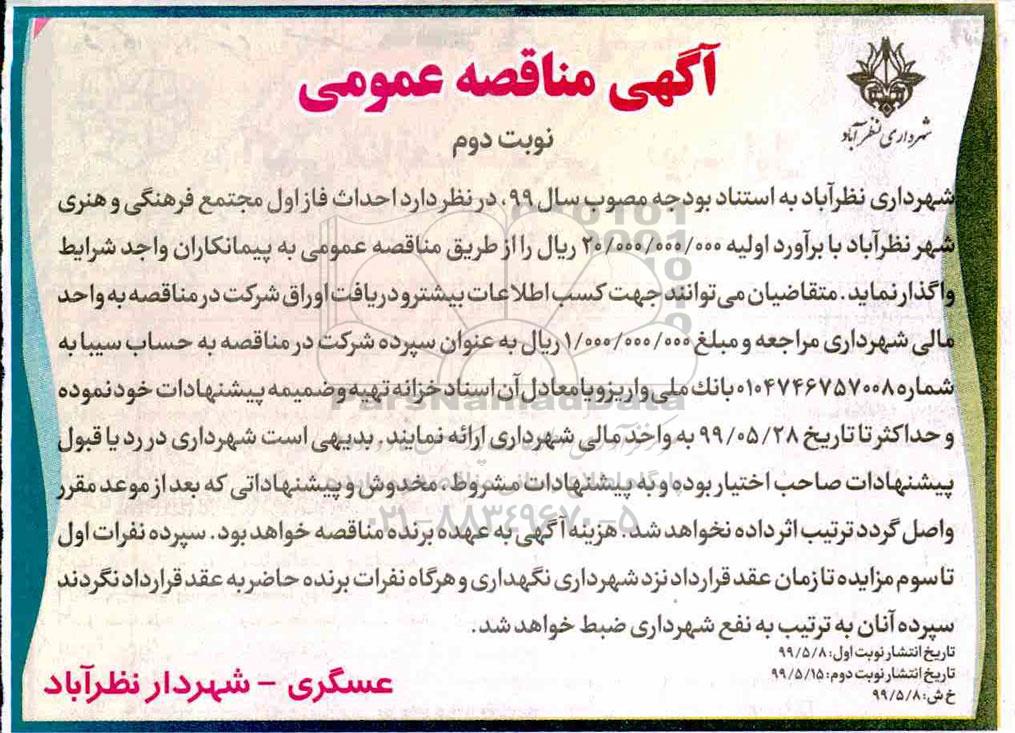 شهرداری نظرآباد به استناد بودجه مصوب سال 99 در نظر دارد احداث فاز اول مجتمع فرهنگی و هنری شهر نظرآباد با برآورد اولیه 20.000.000.000 ریال را از طریق مناقصه عمومی به پیمانکاران واجد شرایط واگذار نماید. متقاضیان می توانند جهت کسب اطلاعات بیشتر و دریافت اوراق شرکت در مناقصه به واحد مالی شهرداری مراجعه و مبلغ 1.000.000.000 ریال به عنوان سپرده شرکت در مناقصه به حسا سیبا به شماره 0104746757008 بانک ملی واریز و یا معادل آن اسناد خزانه تهیه و ضمیمه پیشنهاد خود نموده و حداکثر تا تاریخ 99.5.28 به واحد مالی شهرداری ارایه نمایند.