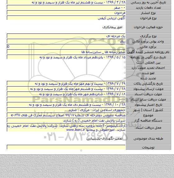 مناقصه, مناقصه عمومی دومرحله ای شماره ۹۹/۱۷ اصلاح سیستم محرک فن های e-۶۳۷ از کلیه افراد متخصص و شرکت‌ها واجد شرایط دعوت به عمل می‌آید در مناقصه با کد خبرگزاری پارس نماد: 2601467 شرکت نمایند. این مناقصه در تاریخ 1399/05/15 شروع و مهلت آن تا تاریخ 1399/07/16 میباشد.