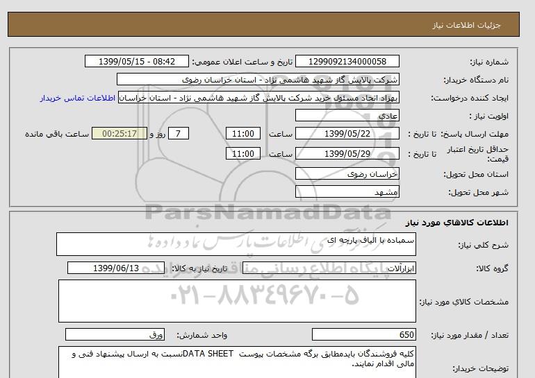 نام دستگاه خریدار:شرکت پالایش گاز شهید هاشمی نژاد - استان خراسان رضوی