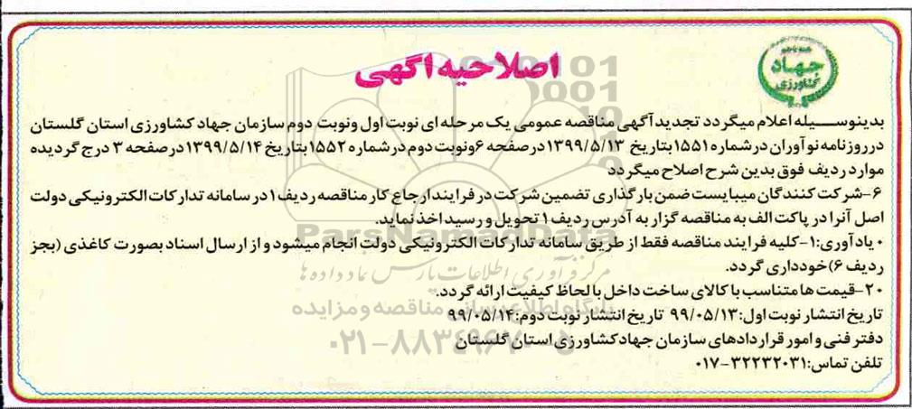 بدینوسیله اعلام میگردد تجدید اگهی مناقصه عمومی یک مرحله ای نوبت اول و نوبت دوم سازمان جهاد کشاورزی استان گلستان در روزنامه نوآوران در شماره 1551 به تاریخ 99.5.13 در صفحه 6 و نوبت دوم در شماره 1552 بتاریخ 99.5.14 در صفحه 3 درج گردیده موارد ردیف فوق بدین شرح اصلاح میگرد