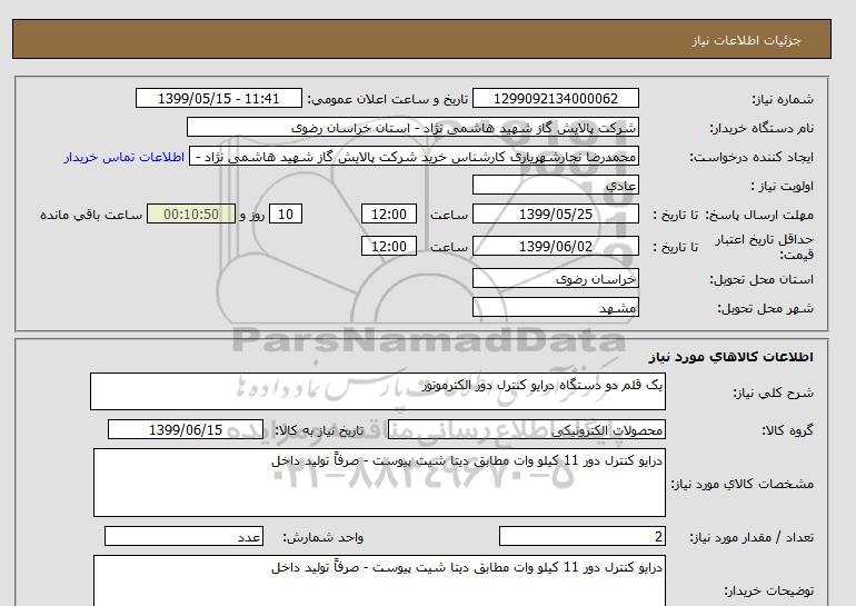 نام دستگاه خریدار:شرکت پالایش گاز شهید هاشمی نژاد - استان خراسان رضوی