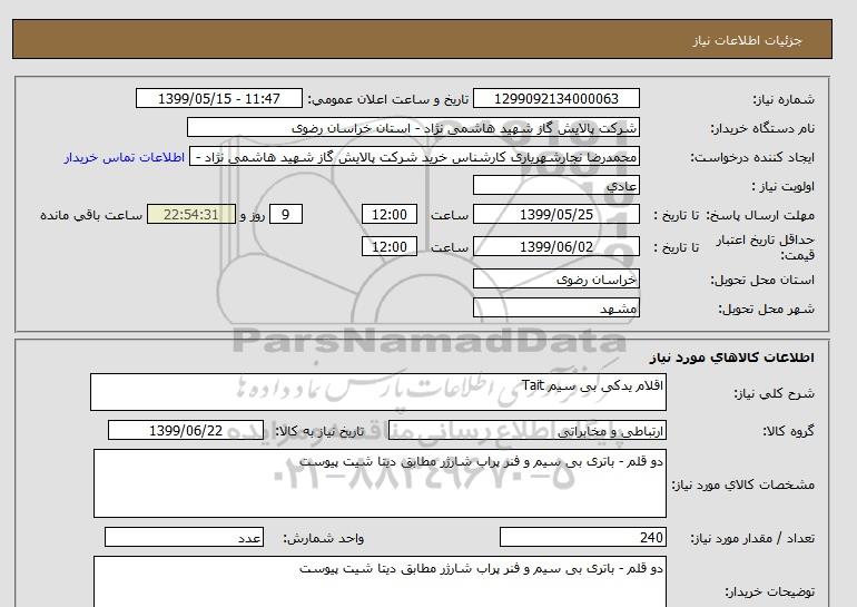 نام دستگاه خریدار:شرکت پالایش گاز شهید هاشمی نژاد - استان خراسان رضوی